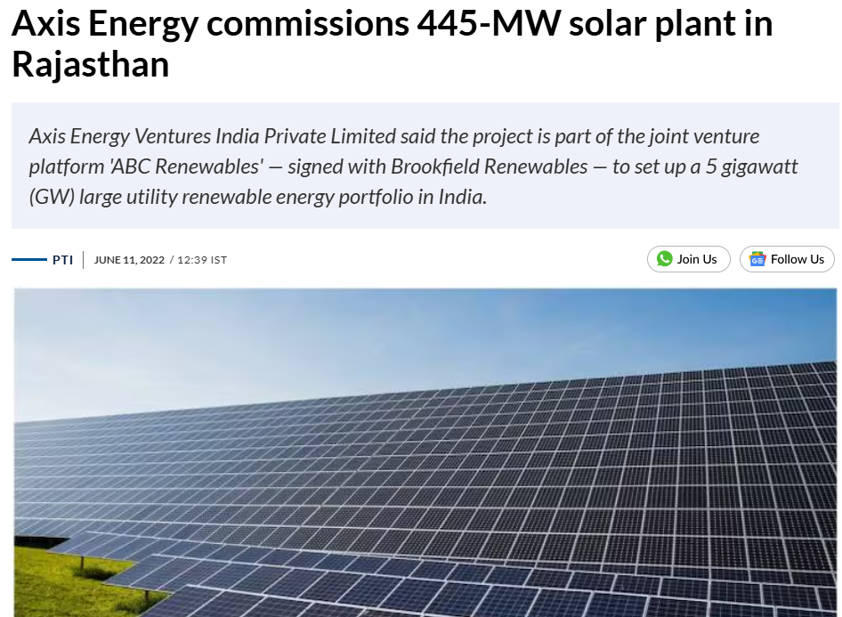 Axis Energy Ventures India Private Limited said the project is part of the joint venture platform ‘ABC Renewables’ — signed with Brookfield Renewables — to set up a 5 gigawatt (GW) large utility renewable energy portfolio in India.