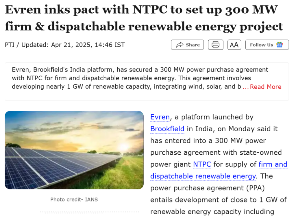 Evren, Brookfield’s India platform, has secured a 300 MW power purchase agreement with NTPC for firm and dispatchable renewable energy. This agreement involves developing nearly 1 GW of renewable capacity, integrating wind, solar, and battery storage. The project aims to efficiently dispatch energy during peak hours, aiding distribution companies in meeting demand and renewable energy obligations.