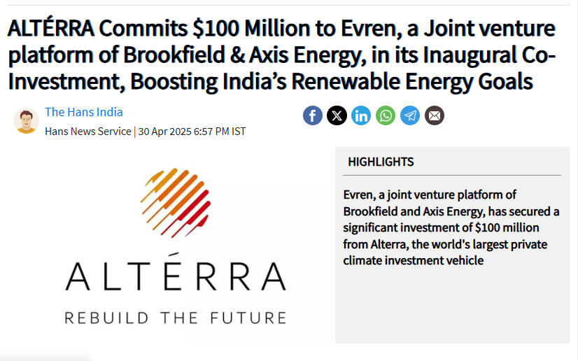 ALTÉRRA Commits $100 Million to Evren, a Joint venture platform of Brookfield & Axis Energy, in