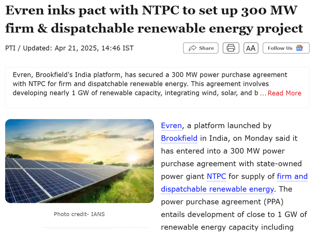 Evren, Brookfield's India platform, has secured a 300 MW power purchase agreement with NTPC for firm