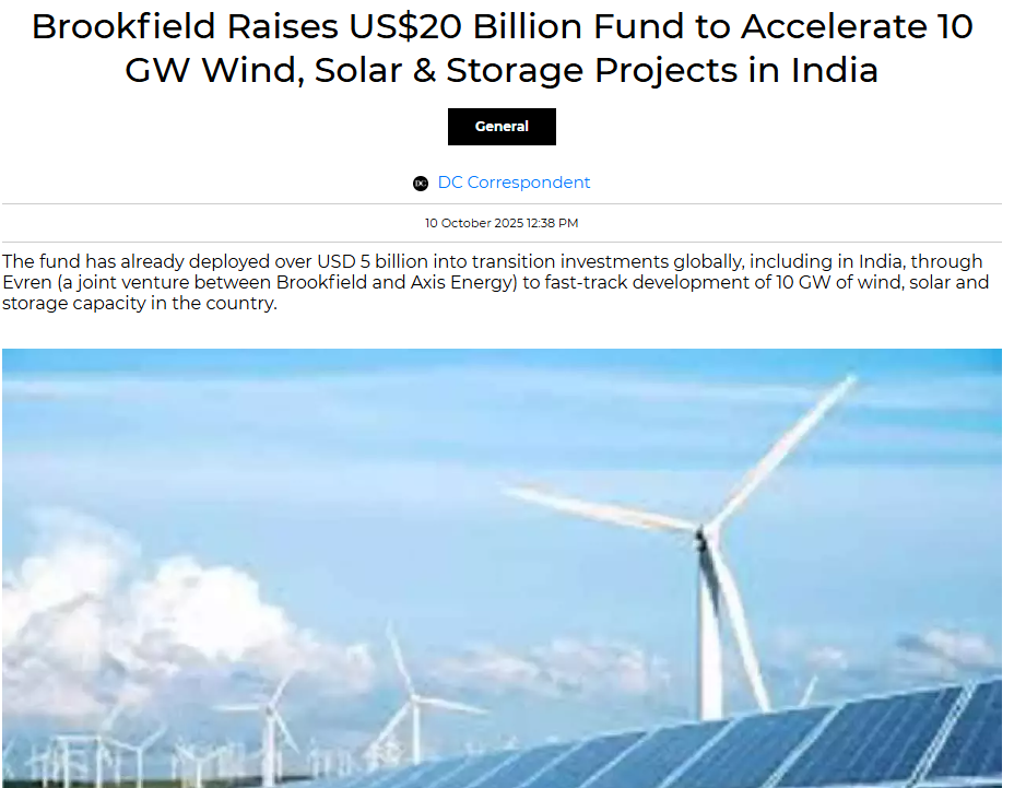 Brookfield Raises US$20 Billion Fund to Accelerate 10 GW Wind, Solar & Storage Projects in India