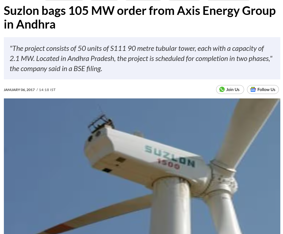 Suzlon bags 105 MW order from Axis Energy Group in Andhra